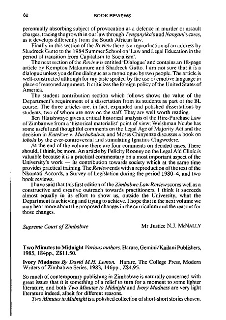 Review of: Two minutes to midnight. Harare: Gemini/Kailani Publishers, 1985; David M.H. Lemon. Ivory madness. Harare: The College Press, 1983