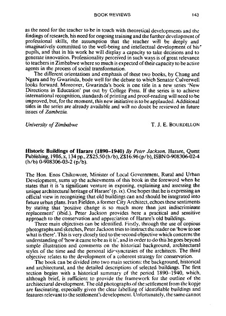 Review of: Peter Jackson. Historic buildings of Harare (1890-1940). Harare, Zimbabwe: Quest Publishing, 1986