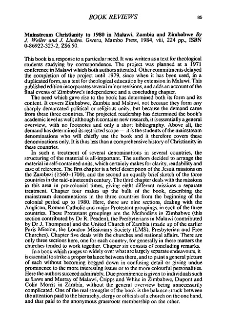 Review of: J. Weller & J. Linden. Mainstream Christianity to 1980 in Malawi, Zambia and Zimbabwe. Gweru: Mambo Press, 1984