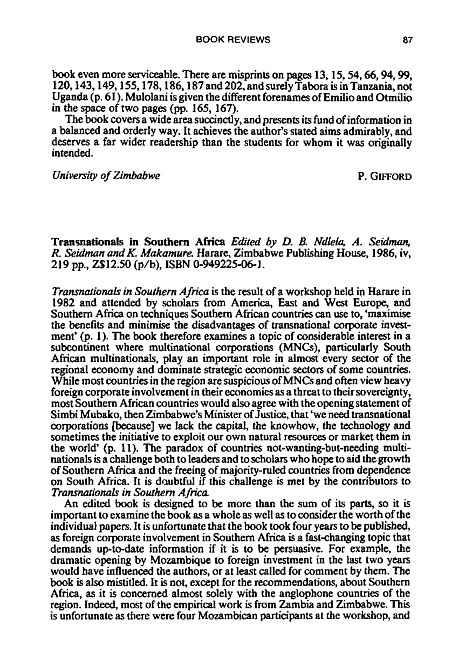 Review of: D.B. Ndlela et al. (eds). Tranationals in Southern Africa. Harare, Zimbabwe: Zimbabwe Publishing House, 1986