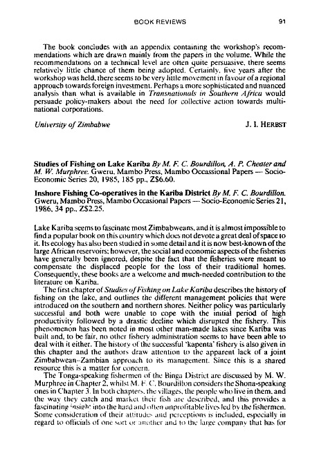 Review of: M.F.C. Bourdillon, A.P. Cheater and M.W. Murphree. Studies of fishing on Lake Kariba. Gweru, Zimbabwe: Mambo Press, 1985; M.F.C. Bourdillon. Inshore fishing cooperatives in the Kariba District. Gweru, Zimbabwe: Mambo Press, 1986
