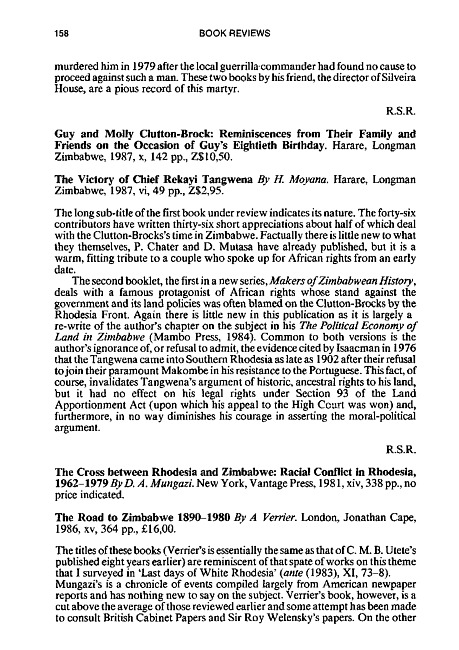 Review of: D.A. Mungazi. The cross between Rhodesia and Zimbabwe. New York: Vantage Press, 1981; A. Verrier. The road to Zimbabwe, 1890-1980. London: Jonathan Cape, 1986