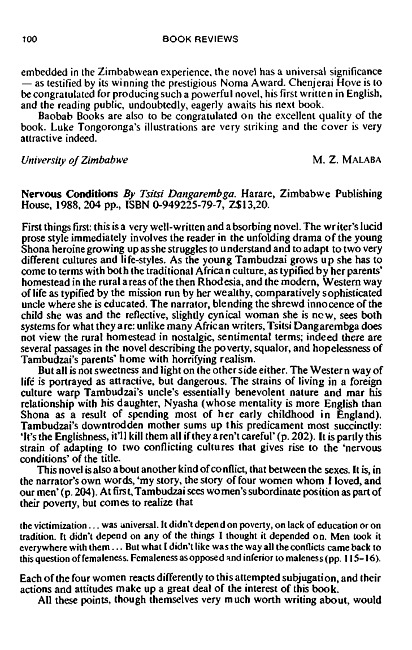 Review of: Tsitsi Dangarembga. Nervous conditions. Harare: Zimbabwe Publishing House, 1988