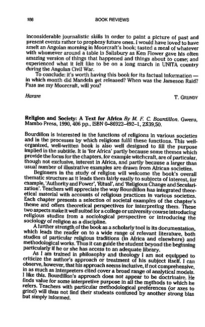 Review of: M.F.C. Bourdillon. Religion and society. Gweru: Mambo Press, 1990