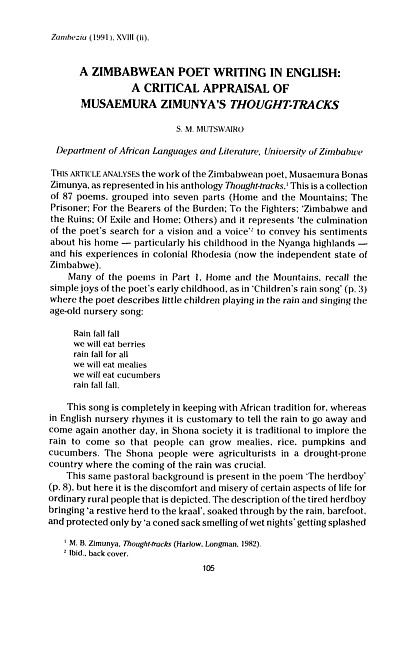 This article analyses the work of the Zimbabwean poet, Musaemura Bonas Zimunya, as represented in his anthology Thought-tracks. This is a collection of 87 poems, grouped into seven parts (Home and the mountains; The prisoner; For the bearers of the burden; To the fighters; 'Zimbabwe and the ruins; Of excile and home; Others) and it represents 'the culmination of the poet's search for a vision and a voice' to convey his sentiments about his home particularly his childhood in the Nyanga highlands and his experiences in colonial Rhodesia (now the independent state of Zimbabwe).
