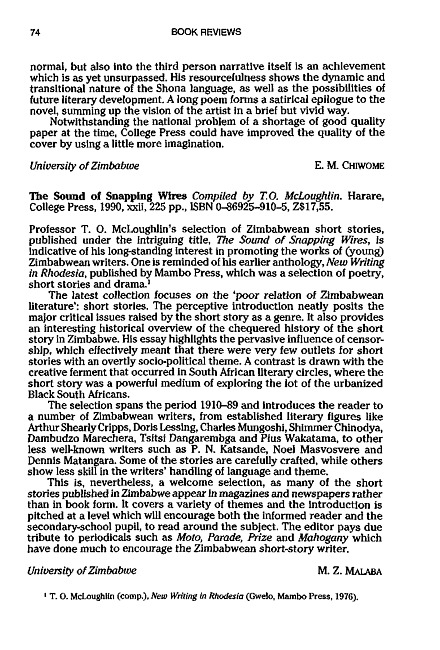 Review of: T.O. McLoughlin. The sound of snapping wires. Harare: College Press, 1990