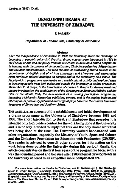 After the independence of Zimbabwe in 1980 the University faced the challenge of becoming a "people's university". Practical drama courses were introduced in 1984 in the Faculty of Arts and the policy from the outset was to develop a drama programme in keeping with the process of democratization, Zimbabweanization, Africanization and socialist transformation. This took the form of establishing drama courses in the departments of English and of African Languages and Literature and encouraging extra-curricular cultural activities on campus and in the community as a whole. The Faculty of Arts programme saw theatre as a useful cultural activity and explored ways of involving people from both inside and outside the University in its first production, Mavambo: First Steps, in the introduction of courses in theatre for development and theatre-in-education, the establishment of the theatre group Zambuko/lzibuko and the Film of the Month Club, the development of a visiting productions programme, launching a University Playscripts publishing venture, and in the staging, both on and off campus, of previously published and original plays based on the cultural forms and languages of Zimbabwe and Southern Africa