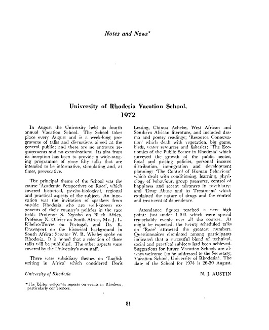 University of Rhodesia Vacation School, 1972