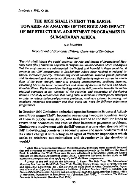 "The rich shall inherit the earth" analyses the role and impact of International Monetary Fund (IMF) Structural Adjustment Programmes in Sub-Saharan Africa and argues that the programmes are mis-targeted, ineffectual and harmful to these countries. It contends that IMF programmes in Sub-Saharan Africa have resulted in reduced incomes, increased poverty, deteriorating social conditions, reduced growth potential and the deepening of dependency. Moreover, IMF austerity regimes worsen the conditions of the poor through, inter alia, growing unemployment, declining incomes, escalating prices for basic commodities and declining access to medical and educational facilities. The laissez-faire ideology which the IMF promotes benefits the industrialized countries at the expense of the societies and economies of developing nations. The study recommends that ruling elites re-think their development strategies in order to reduce balance-of-payments problems, minimize external borrowing, use available resources responsibly and thus avoid the need for IMF-type adjustment programmes.