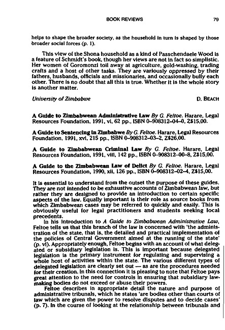 Review of: G. Feltoe. A guide to Zimbabwean administrative law. Harare: Legal Resources Foundation, 1991; G. Feltoe. A guide to sentencing in Zimbabwe. Harare: Legal Resources Foundation, 1991; G. Feltoe. A guide to Zimbabwean criminal law. Harare: Legal Resources Foundation, 1991; Feltoe, G. A guide to the Zimbabwean law of delict. Harare: Legal Resources Foundation, 1990