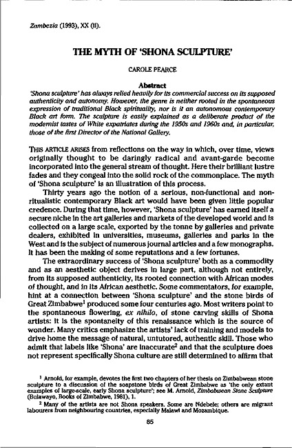 "Shona sculpture" has always relied heavily for its commercial success on its supposed authenticity and autonomy. However, the genre is neither rooted in the spontaneous expression of traditional Black spirituality, nor is it an autonomous contemporary Black art form. The sculpture is easily explained as a deliberate product of the modernist tastes of White expatriates during the 1950s and 1960s and, in particular, those of the first Director of the National Gallery