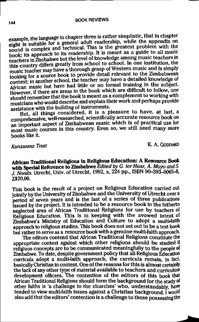 Review of: G. ter Haar, A. Moyo, S.J. Nondo (eds). African traditional religions in religious education. Utrecht: Utrecht University, 1992