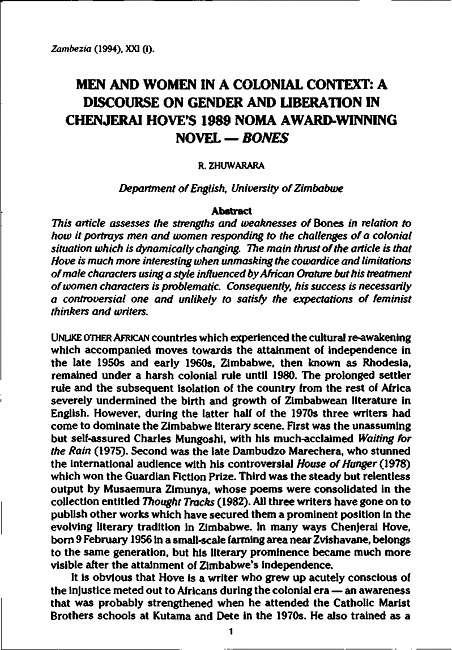 This article assesses the strengths and weaknesses of Bones in relation to how it portrays men and women responding to the challenges of a colonial situation which is dynamically changing. The main thrust of the article is that Hove is much more interesting when unmasking the cowardice and limitations of male characters using a style influenced by African Orature but his treatment of women characters is problematic. Consequently, his success is necessarily a controversial one and unlikely to satisfy the expectations of feminist thinkers and writers