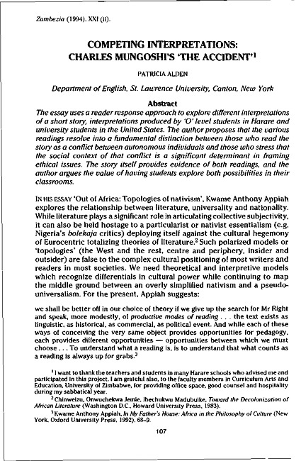 The essay uses a reader response approach to explore different interpretations of a short story, interpretations produced by "O" level students in Harare and university students in the United States. The author proposes that the various readings resolve into a hindamental distinction between those who read the story as a conflict between autonomous individuals and those who stress that the social context of that conflict is a significant determinant in framing ethical issues. The story itself provides evidence of both readings, and the author argues the value of having students explore both possibilities in their classrooms