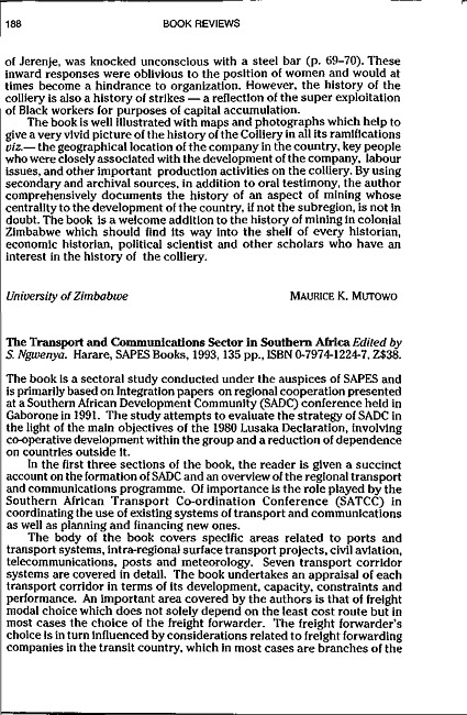 Review of: S. Ngwenya (ed.). The transport and communications sector in Southern Africa. Harare: SAPES Books, 1993