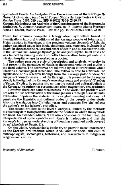 Review of: Herbert Aschwanden. Symbols of death. Gweru: Mambo Press, 1987; Herbert Aschwanden. Karanga mythology. Gweru: Mambo Press, 1989