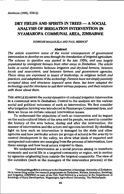 The article examines some of the social consequences of government intervention to develop an area through the introduction of irrigated agriculture. The scheme in question was started in the late 1950s, and was largely populated by immigrant farmers from other areas in Zimbabwe. The article looks at social dynamics between irrigators and dry-land farmers, between locals and newcomers, and between farmers and government agencies. These ideas are expressed in issues of leadership, in religious beliefs and practices, and adaptations of the technology. Farmers have not simply passively accepted ideas and structures imposed upon them, but have adapted the technology and the structures to suit their various purposes, and their relations with those about them.