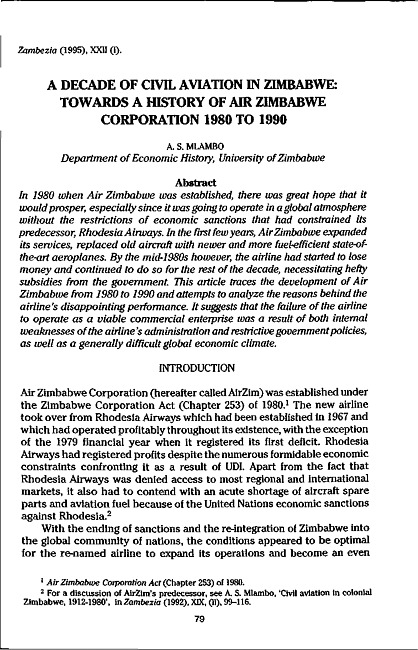In 1980 when Air Zimbabwe was established, there was great hope that it would prosper, especially since it was going to operate in a global atmosphere without the restrictions of economic sanctions that had constrained its predecessor, Rhodesia Airways. In the first few years, Air Zimbabwe expanded its services, replaced old aircraft with newer and more fuel-efficient state-of-the-art aeroplanes. By the mid-1980s however, the airline had started to lose money and continued to do so for the rest of the decade, necessitating hefty subsidies from the government. This article traces the development of Air Zimbabwe from 1980 to 1990 and attempts to analyze the reasons behind the airline's disappointing performance. It suggests that the failure of the airline to operate as a viable commercial enterprise was a result of both internal weaknesses of the airline's administration and restrictive government policies, as well as a generally difficult global economic climate.