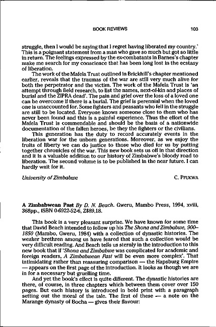 Review of: D.N. Beach. A Zimbabwean past. Gweru: Mambo Press, 1994