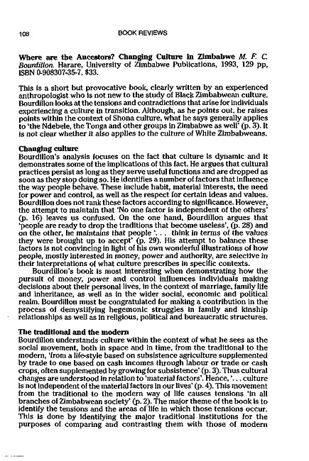 Review of: M.F.C. Bourdillon. Where are the ancestors? Harare: University of Zimbabwe Publications, 1993