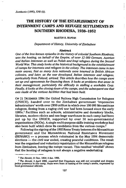 One of the less known episodes in the history of colonial Southern Rhodesia, was the hosting, on behalf of the Empire, of over 12000 German, Austrian and Italian internees as well as Polish and Iraqi reftigees during the Second World War. This study looks at the historical background to the establishment of camps for internees and renigees in the colony. The internees came in two main waves, first as many Axis nationals were interned in British African colonies, and later, as the war developed, Italian internees and refugees, particularly from Poland, arrived. This article describes how the camps were set up and agreements for financing them. It looks at problems that arose in their management, particularly the difficulty in staffing a workable Corp. Finally, it looks at the closing down of the camps, and the subsequent use that was made of the various facilities that had been built.