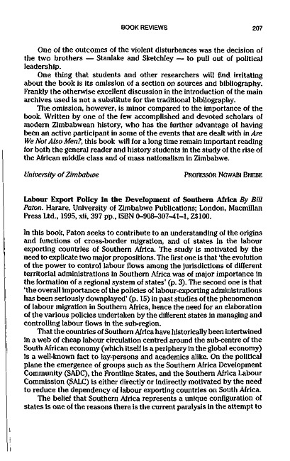 Review of: Bill Paton. Labour export policy in the development of Southern Africa. Harare: University of Zimbabwe Publications, 1995