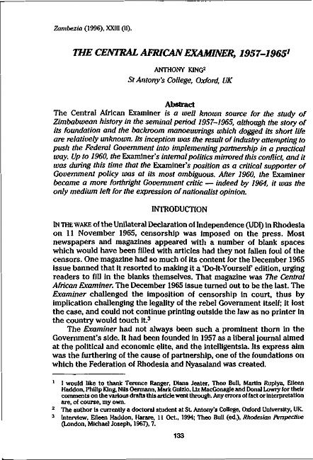 The Central African Examiner is a well known source for the study of Zimbabwean history in the seminal period 1957-1965, although the story of its foundation and the backroom manoeuvrings which dogged its short life are relatively unknown. Its inception was the result of industry attempting to push the Federal Government into implementing partnership in a practical way. Up to 1960, the Examiner's internal politics mirrored this conflict, and it was during this time that the Examiner's position as a critical supporter of Government policy was at its most ambiguous. After 1960, the Examiner became a more forthright Government critic indeed by 1964, it was the only medium left for the expression of nationalist opinion