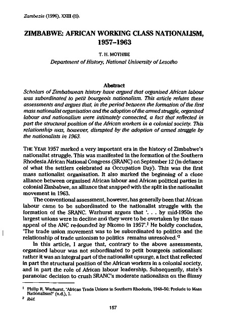 Scholars of Zimbabwean history have argued that organised African labour was subordinated to petit bourgeois nationalism. This article refutes these assessments and argues that, in the period between the formation of the first mass nationalist organisation and the adoption of the armed struggle, organised labour and nationalism were intimately connected, a fact that reflected in part the structural position of the African workers in a colonial society. This relationship was, however, disrupted by the adoption of armed struggle by the nationalists in 1963.