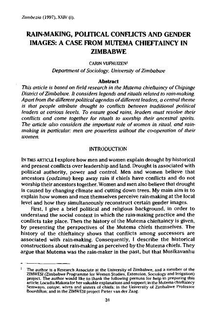 This article is based on field research in the Mutema chieftaincy of Chipinge District of Zimbabwe. It considers legends and rituals related to rain-making. Apart from the different political agendas of different leaders, a central theme is that people attribute drought to conflicts between traditional political leaders at various levels. To ensure good rains, leaders must resolve their conflicts and come together for rituals to worship their ancestral spirits. The article also considers the important role of women in ritual, and rainmaking in particular: men are powerless without the co-operation of their women.