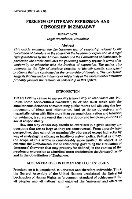This article examines the Zimbabwean law of censorship relating to the circulation of literature in the context of the freedom of expression as a legal right guaranteed by the African Charter and the Constitution of Zimbabwe. In particular, the article evaluates the governing statutory regime in terms of its conformity or otherwise with the freedom of expression. The author also attempts, in the light of previous practice, to identify specific conceptual problems that are confronted in the censorship of literature. The conclusion suggests that the undue influence of subjectivity in the assessment of literature probably justifies the removal of censorship in this sphere.