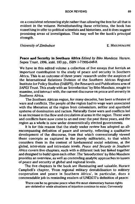 Review of: Ibbo Mandaza (ed.). Peace and security in Southern Africa. Harare: SAPES Trust, 1996