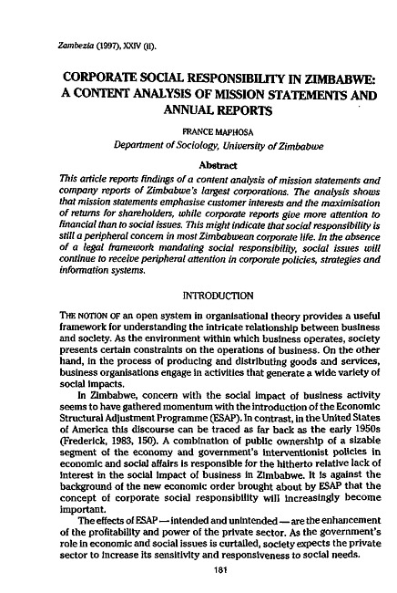 Corporate social responsibility in Zimbabwe : a content analysis of mission statements and annual reports