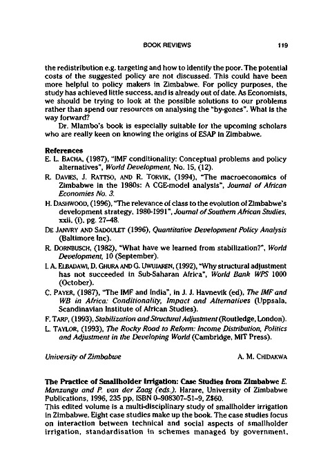 Review of: E. Manzungu & P. van der Zaag (eds). The practice of smallholder irrigation. Harare: University of Zimbabwe Publications, 1996