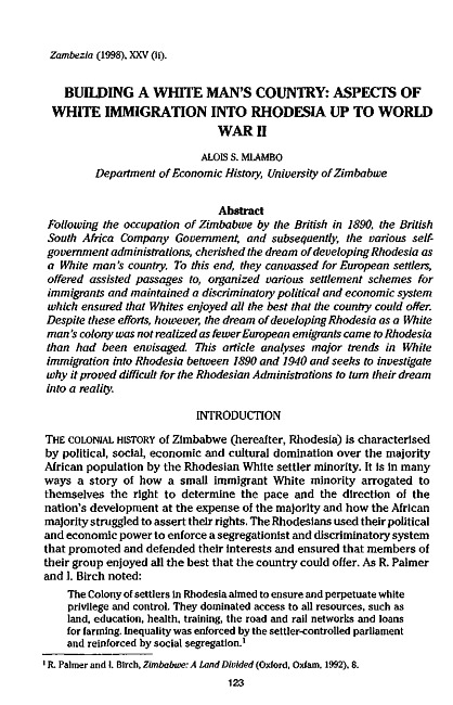 Following the occupation of Zimbabwe by the British in 1890, the British South Africa Company Government, and subsequently, the various self-government administrations, cherished the dream of developing Rhodesia as a White man's country. To this end, they canvassed for European settlers, offered assisted passages to, organized various settlement schemes for immigrants and maintained a discriminatory political and economic system which ensured that Whites enjoyed all the best that the country could offer. Despite these efforts, however, the dream of developing Rhodesia as a White man's colony was not realized as fewer European emigrants came to Rhodesia than had been envisaged. This article analyses major trends in White immigration into Rhodesia between 1890 and 1940 and seeks to investigate why it proved difficult for the Rhodesian Administrations to turn their dream into a reality.