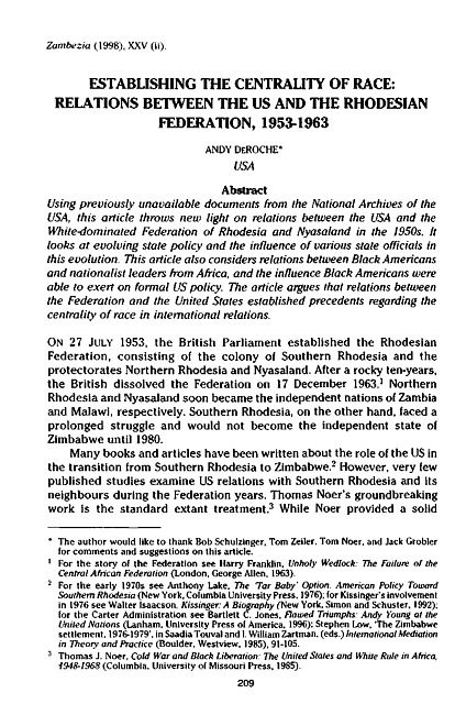 Using previously unavailable documents from the National Archives of the USA, this article throws new light on relations between the USA and the White-dominated Federation of Rhodesia and Nyasaland in the 1950s. It looks at evolving state policy and the influence of various state officials in this evolution. This article also considers relations between Black Americans and nationalist leaders from Africa, and the influence Black Americans were able to exert on formal US policy. The article argues that relations between the Federation and the United States established precedents regarding the centrality of race in international relations.