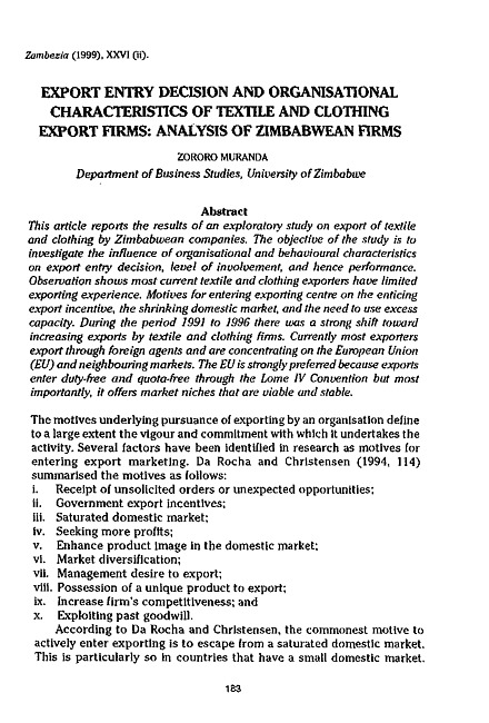 This article reports the results of an exploratory study on export of textile and clothing by Zimbabwean companies. The objective of the study is to investigate the influence of organisational and behavioural characteristics on export entry decision, level of involvement, and hence performance. Observation shows most current textile and clothing exporters have limited exporting experience. Motives for entering exporting centre on the enticing export incentive, the shrinking domestic market, and the need to use excess capacity. During the period 1991 to 1996 there was a strong shift toward increasing exports by textile and clothing firms. Currently most exporters export through foreign agents and are concentrating on the European Union (EU) and neighbouring markets. The EU is strongly preferred because exports enter duty-free and quota-free through the Lome W Convention but most importantly, it offers market niches that are viable and stable.
