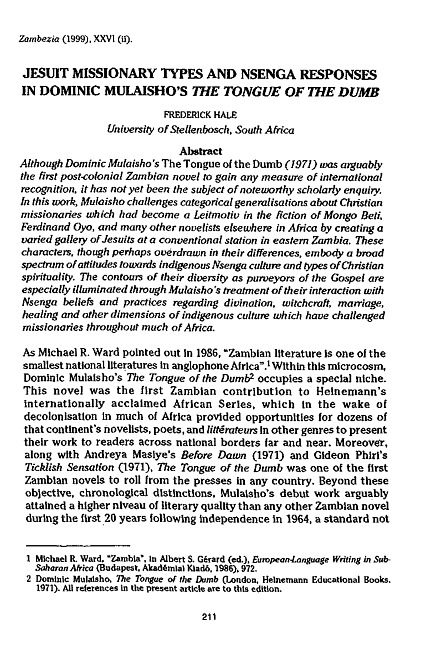 Although Dominic Mulaisho's The Tongue of the Dumb (1971) was arguably the first post-colonial Zambian novel to gain any measure of international recognition, it has not yet been the subject of noteworthy scholarly enquiry. In this work, Mulaisho challenges categorical generalisations about Christian missionaries which had become a Leitmotiv in the fiction of Mongo Beti, Ferdinand Oyo, and many other novelists elsewhere in Africa by creating a varied gallery of Jesuits at a conventional station in eastern Zambia. These characters, though perhaps overdrawn in their differences, embody a broad spectrum of attitudes towards indigenous Nsenga culture and types of Christian spirituality. The contours of their diversity as purveyors of the Gospel are especially illuminated through Mulaisho's treatment of their interaction with Nsenga beliefs and practices regarding divination, witchcraft, marriage, healing and other dimensions of indigenous culture which have challenged missionaries throughout much of Africa.