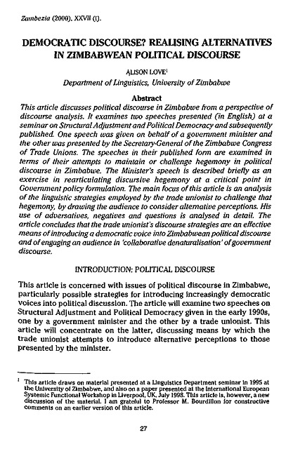This article discusses political discourse in Zimbabwe from a perspective of discourse analysis. It examines two speeches presented (in English) at a seminar on Structural Adjustment and Political Democracy and subsequently published. One speech was given on behalf of a government minister and the other was presented by the Secretary-General of the Zimbabwe Congress of Trade Unions. The speeches in their published form are examined in terms of their attempts to maintain or challenge hegemony in political discourse in Zimbabwe. The Minister's speech is described briefly as an exercise in rearticulating discursive hegemony at a critical point in Government policy formulation. The main focus of this article is an analysis of the linguistic strategies employed by the trade unionist to challenge that hegemony, by drawing the audience to consider alternative perceptions. His use of adversatives, negatives and questions is analysed in detail. The article concludes that the trade unionist's discourse strategies are an effective means of introducing a democratic voice into Zimbabwean political discourse and of engaging an audience in "collaborative denaturalisation" of government discourse.