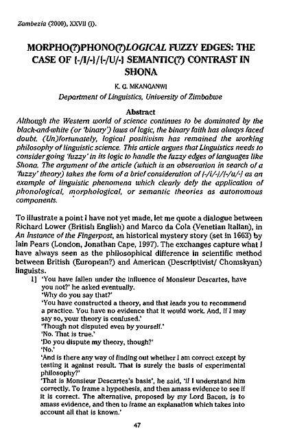 Although the Western world of science continues to be dominated by the black-and-white (or "binary") laws of logic, the binary faith has always faced doubt. (Unfortunately, logical positivism has remained the working philosophy of linguistic science. This article argues that Linguistics needs to consider going "fuzzy" in its logic to handle the fuzzy edges of languages like Shona. The argument of the article (which is an observation in search of a "fuzzy" theory) takes the form of a brief consideration of {-/i/-}/{-/u/-} as an example of linguistic phenomena which clearly defy the application of phonological, morphological, or semantic theories as autonomous components.
