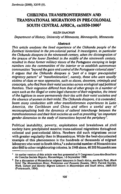 This article analyses the lived experience of the Chikunda people of the Zambezi hinterland in the pre-colonial period. It investigates, in particular the Chikunda diaspora in the nineteenth century, when the disintegration of the prazos of the lower Zambezi in the middle of the nineteenth century, resulted in these former military slaves of the Portuguese escaping in large numbers into the communities of the interior or to establish autonomous communities "beyond the gaze and control of the Portuguese colonial state". It argues that the Chikunda diaspora is "part of a larger pre-capitalist migratory pattern" of "transfontiersmen" namely, those who were usually victims of class or race oppression, such as slaves, deserters, criminals and conscripts, who fled from their natal societies across ecological and political frontiers. Their migration differed from that of other groups in a number of ways such as the illegal or extra legal character of their migration, the intent of the fugitives to sever permanently their ties with their natal societies and the absence of women in their midst. The Chikunda diaspora, it is contended, bears many similarities with other transfontiersmen experiences in Latin America, the Caribbean and China and offers a useful way of reconceptualising both the dynamics of cultural interchange between the transfrontiersmen and their host societies as well as providing "an important gender dimension to the study of interactions beyond the periphery".