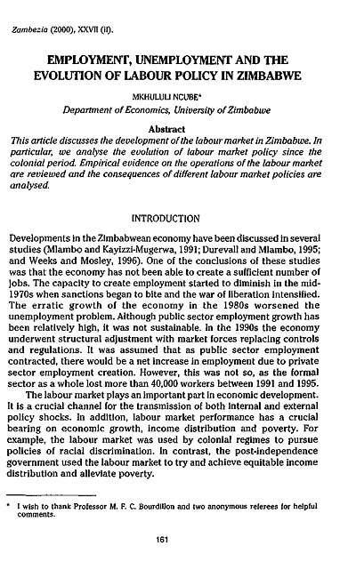 This article discusses the development of the labour market in Zimbabwe. In particular, we analyse the evolution of labour market policy since the colonial period. Empirical evidence on the operations of the labour market are reviewed and the consequences of different labour market policies are analysed.