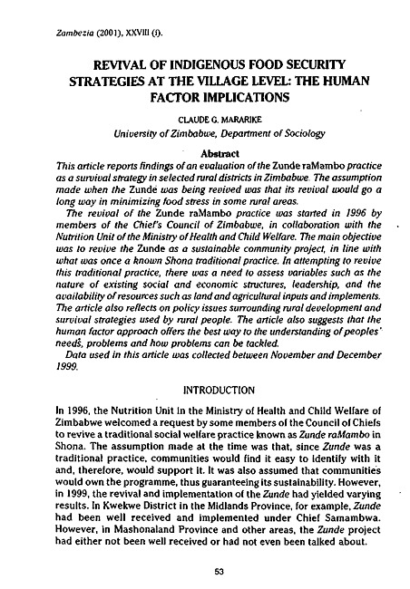 This article reports findings of an evaluation of the Zunde raMambo practice as a survival strategy in selected rural districts in Zimbabwe. The assumption made when the Zunde was being revived was that its revival would go a long way in minimizing food stress in some rural areas. The revival of the Zunde raMambo practice was started in 1996 by members of the Chief's Council of Zimbabwe, in collaboration with the Nutrition Unit of the Ministry of Health and Child Welfare. The main objective was to revive the Zunde as a sustainable community project, in line with what was once a known Shona traditional practice. In attempting to revive this traditional practice, there was a need to assess variables such as the nature of existing social and economic structures, leadership, and the availability of resources such as land and agricultural inputs and implements. The article also reflects on policy issues surrounding rural development and survival strategies used by rural people. The article also suggests that the human factor approach offers the best way to the understanding of peoples' needs, problems and how problems can be tackled. Data used in this article was collected between November and December 1999.