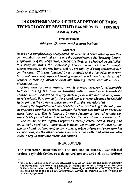Based on a sample survey of re(settled) households differentiated by whether any member was trained or not and their proximity to the Training Centre, employing Logistic Regression, Chi-Square Test, and Descriptive Statistics, this study examined the relationship between resources and household characteristics, on the one hand, and the probability of being trained or not, on the other. This was followed by an analysis of the log odds of a farm household adopting improved fanning methods in relation to its status with respect to training, distance from the Training Centre and other social characteristics. Unlike with resources owned, there is a more systematic relationship between taking the offer of training with non-resource household characteristics - education, sex, age and the prior residence and occupation of re(settlers). Paradoxically, the probability of a more educated household head joining the course is much smaller than the less educated. Among the hypothesised household characteristics leading to the adoption of improved farming practices, whether the farmer was trained or not is the most important. This is followed by the educational level of female, run households [as actual or de facto heads in the case of migrant husbands]. The results of the logistics regression clearly established a strong and statistically significant relationship between the probability of adoption on the one hand, training and, to some extent, urban origins and prior farming occupations, on the other. Those who own more cattle and oxen are also more likely to train and adopt innovations.