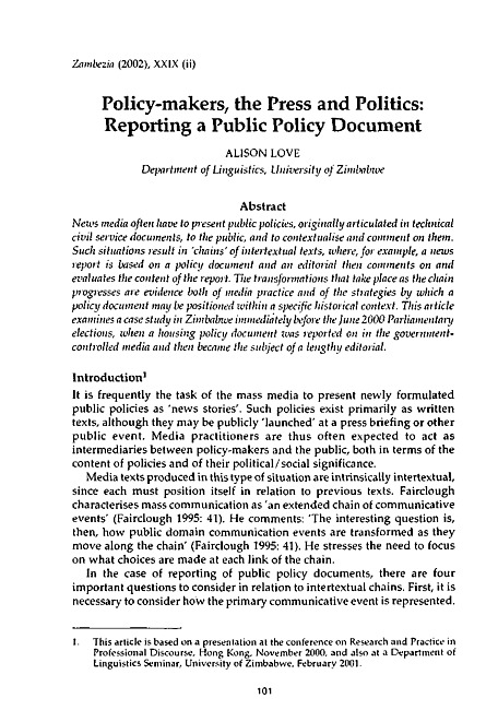 News media often have to present public policies, originally articulated in technical civil service documents, to the public, and to contextualise and comment on them. Such situations result in 'chains' of intertextual texts, where, for example, a news report is based on a policy document and an editorial then comments on and evaluates the content of the report. The transformations that take place as the chain progresses are evidence both of media practice and of the strategies by which a policy document may be positioned within a specific historical context. This article examines a case study in Zimbabwe immediately before the June 2000 Parliamentary elections, when a housing policy document was reported on in the government controlled media and then became the subject of a lengthy editorial.