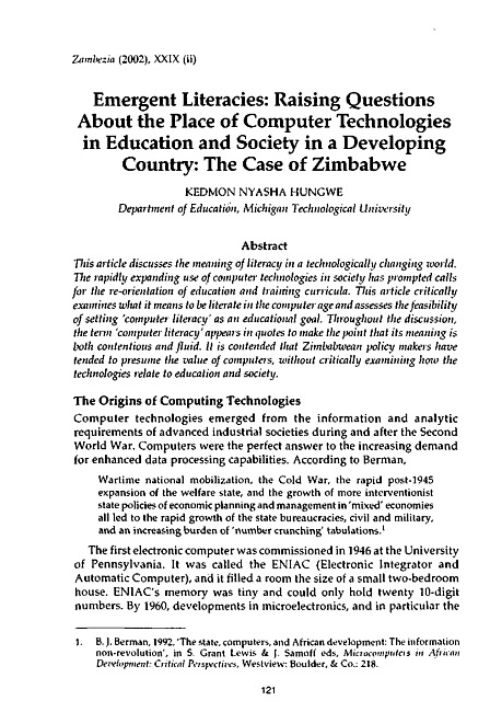 This article discusses the meaning of literacy in a technologically changing world. The rapidly expanding use of computer technologies in society has prompted calls for the re-orientation of education and training curricula. This article critically examines what it means to be literate in the computer age and assesses the feasibility of setting "computer literacy" as an educational goal. Throughout the discussion, the term "computer literacy" appears in quotes to make the point that its meaning is both contentious and fluid. It is contended that Zimbabwean policy makers have tended to presume the value of computers, without critically examining how the technologies relate to education and society.