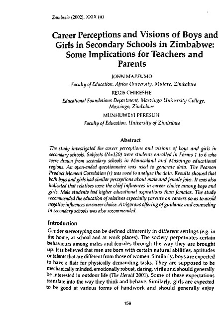 Career perceptions and visions of boys and girls in secondary schools in Zimbabwe : some implications for teachers and parents