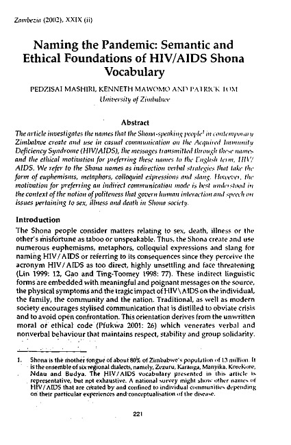 This article investigates the names that the Shona-speaking people in contemporary Zimbabwe create and use in casual communication on the Acquired Immunity Deficiency Syndrome (HIV/AIDS), the messages transmitted through these names and the ethical motivation for preferring these names to the English term HlV/AIDS. We refer to the Shona names as indirection verbal strategies that take the form of euphemisms, metaphors, colloquial expressions and slang. However, the motivation for preferring an indirect communication mode is best understood in the context of the notion of politeness that govern human interaction and speech on issues pertaining to sex, illiess and death in Shona society.