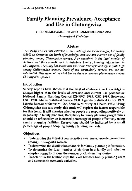Family planning prevalence, acceptance and use in Chitungwiza