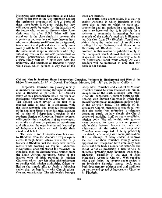 Review of: M.L. Daneel. Old and new in Southern Shona Independent Churches. Vol. 1. The Hague: Mouton, 1971