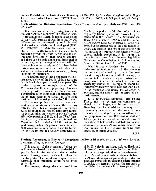 Review of: D. Hobart Houghton and Jenifer Dagut. Source material on the South African economy. Cape Town: Oxford University Press, 1972-1973; Freda Troup. South Africa. London: Eyre Methuen, 1972